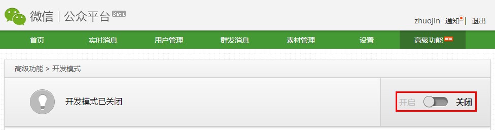 5.1 登录微信公众平台 -> 高能功能 -> 开发模式