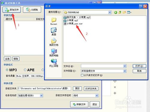 2、之后,即会弹出格式转化页面,在该页面中点击“添加文件”,之后会弹出选择文件页面,选择需要格式转换的歌曲,点击“打开”。