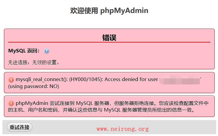 xampp安装完成后,phpmyadmin密码默认为空,浏览器访问phpmyadmin直接进入管理首页,给phpmyadmin管理帐号设置密码后,登录页面直接显示连接错误,没有登录窗口。